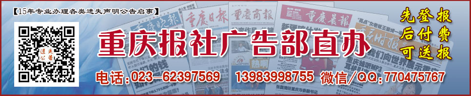 重庆报业集团(重庆晨报、晚报、商报、日报、时报)登报023-62397569:专业快速发布各类重庆遗失声明、重庆注销公告、重庆清算公告、重庆减资公告、重庆法院公告、重庆招标公告、重庆拍卖公告、重庆寻人寻物启事、重庆个人公司证件遗失登报等。详情咨询:023-62397569